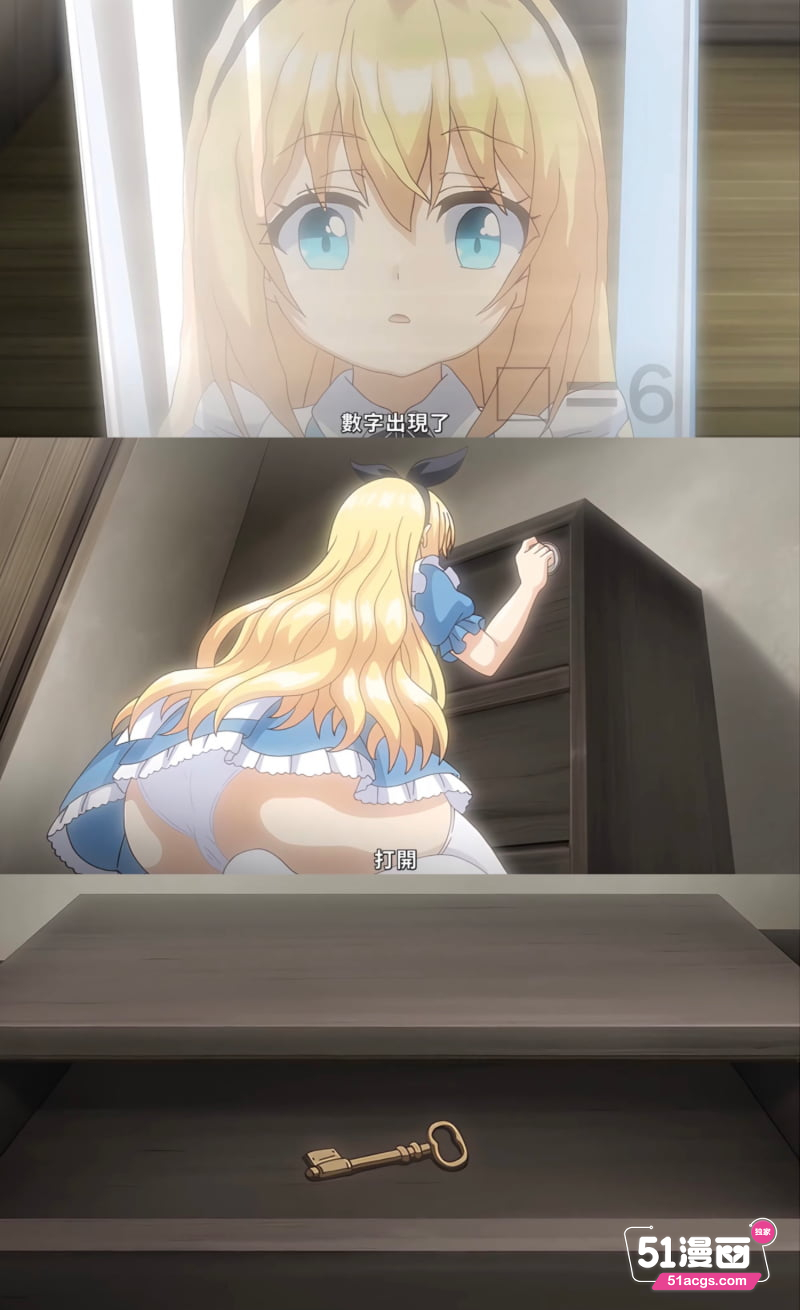 愛麗絲還説不能跟畜生打炮,幹著幹著她也高潮,也回到了現實,一旁的門也突然開了。愛麗絲也往下走,第一話就這樣結束啦~